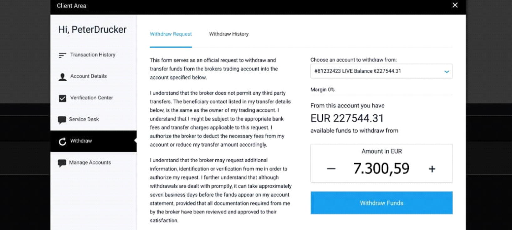 Cuando inicié sesión en mi cuenta una semana más tarde, descubrí que casi el 80% de las transacciones eran positivas, mientras que el 20% restante eran negativas. Y el saldo de mi cuenta en ese momento era de... ¡9620 €! Decidí retirar 7300 € para comprarle un regalo a mi esposo. El dinero estaba en mi cuenta al día siguiente: